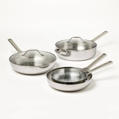 - Aluminum cores are fully surrounded by two layers of stainless steel to help distribute heat quickly and evenly