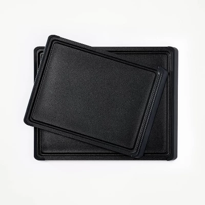 Slicing, dicing and chopping ingredients will be easier than ever with this 2-Piece Nonslip Recycled Poly Cutting Board Set from Figmint™. Made from recycled polyester in black, this set includes medium and large black cutting boards with smooth surfaces for easy swiping of ingredients and easy cleaning. The boards have nonslip sides that grip your countertop to keep them in place, and tapered edges make them easy to lift off the countertop to help prevent dropped ingredients. Integrated juice grooves help reduce spills, and the boards can be tossed in the dishwasher for easy cleaning after use.