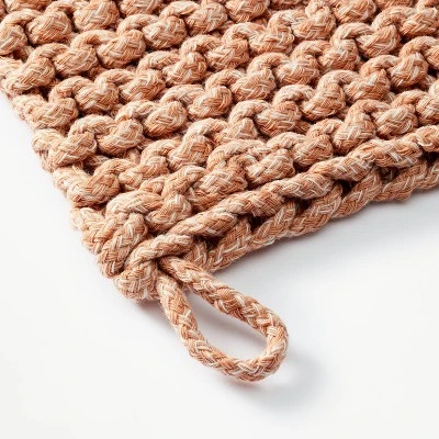 Keep your countertop or tabletop safe from heat while serving with this 7-Inch Rope Trivet from Figmint™. This woven fabric trivet has a cool rope design in a marled terracotta orange color scheme that will brighten any surface in your kitchen. Great for helping protect your table surface from scratches and burns, it can be spot cleaned or wiped clean for a quick refresh when needed.
