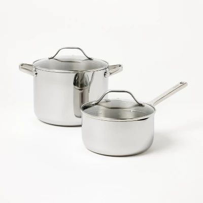 - Includes frying pan, sauté pan with lid, stockpot with lid and saucepan with lid