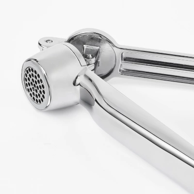- Metal garlic press takes the effort out of crushing garlic