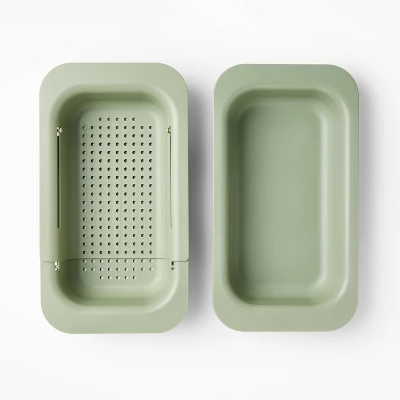Prep your freshest ingredients with ease using the Plastic Narrow Over-The-Sink Expandable Colander with Soaking Tray from Figmint™. This over-the-sink colander features an expandable design, removable strainer and soaking tray that make washing and separating your fruits and veggies extra convenient. Made of BPA-free plastic in a green hue, its narrow size is perfect for smaller sinks. Plus, it’s dishwasher safe, letting you clean up after cooking in no time.
